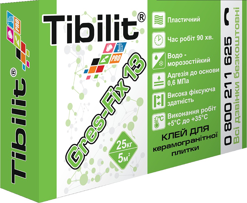 Клейова суміш «Gres-Fix 13» призначена для облицювання бетонних, цегляних, цементно-піщаних, цементно-вапняних штукатурок, монолітних підлог керамогранітною плиткою, та штучним каменем з водопоглинанням менше 0,1% і розміром не більше 600х600мм.