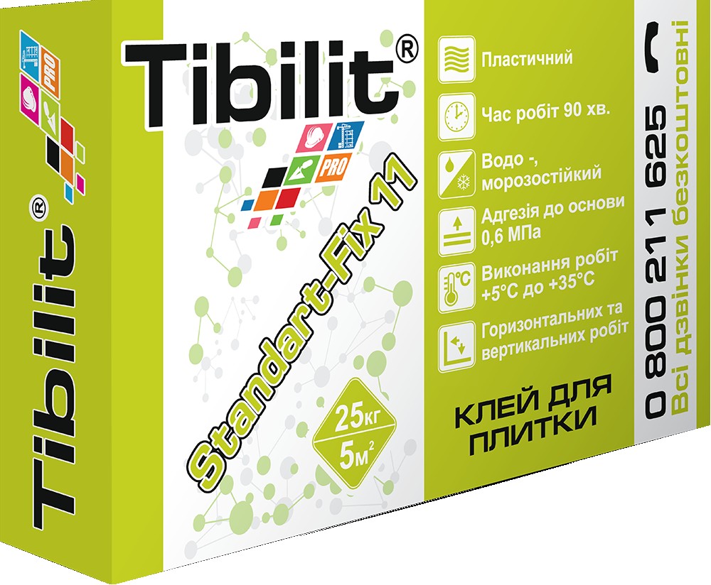 Клейова суміш «Standart-Fix 11» призначений для облицювання бетонних, цегляних, цементно-піщаних, цементно-вапняних штукатурок, монолітних підлог керамічною бетонною плиткою та штучним каменем з водопоглинанням не менше 3% і розміром не більше 400х400мм. Клей використовують всередині і зовні споруд.