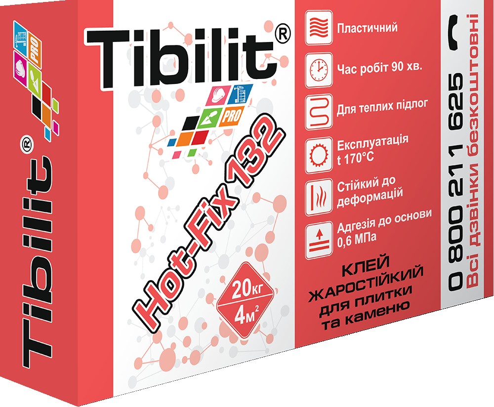Клейова суміш «Hot-Fix 132» призначена для облицювання камінів, печей, «теплих підлог» (де немає прямого контакту з нагрівальним елементом), а також вертикальних поверхонь усіма видами плиток з природнього, штучного і литого каменю, а також бетонних, керамічних облицювальних плиток розміром не більше 400х400мм і з водопоглинанням не менше 1%.